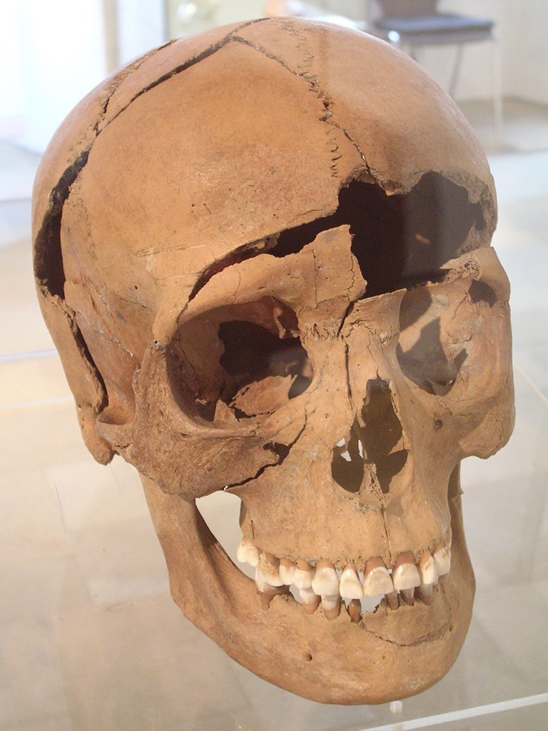 Abb.8: Wie schrecklich germanische Angreifer in der Provinz hausen konnten, belegen die Funde aus einem Gutshof in Regensburg-Harting, der wahrscheinlich irgendwann Mitte des 3.Jh. geplündert und zerstört wurde. Die Bewohner des Anwesens – Männer, Frauen und Kinder – wurden erst gefoltert (die Frauen sogar lebend skalpiert!) und dann ermordet, indem man ihre Schädel mit einem stumpfen Gegenstand zer-trümmerte. Anschließend wurden die Mordopfer zerhackt und in die Hofbrunnen geworfen. Hintergrund könnte eine primitive Opferzeremonie gewesen sein. Aus Britannien weiß man inzwischen allerdings, dass Menschenopfer nicht nur im Barbaricum praktiziert wurden, sondern während der chaotischen ‚Reichskrise’ im 3.Jh. auch in abgelegenen Regionen des Imperiums wieder auflebten. Links: zertrümmerter Frauen-schädel aus Regensburg-Harting. Über dem rechten Auge Skalpierungsspuren.   |